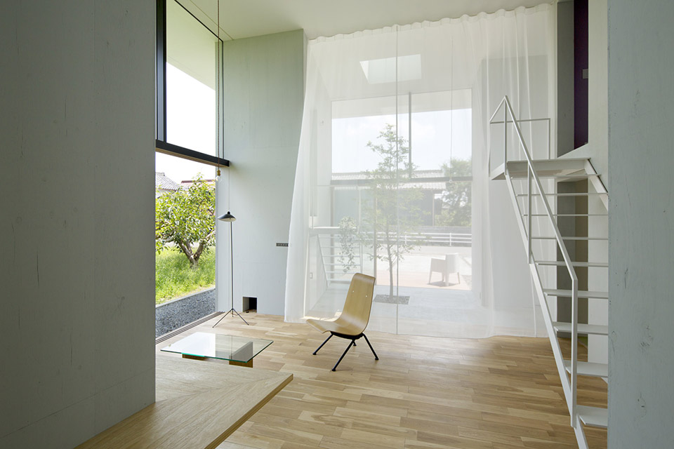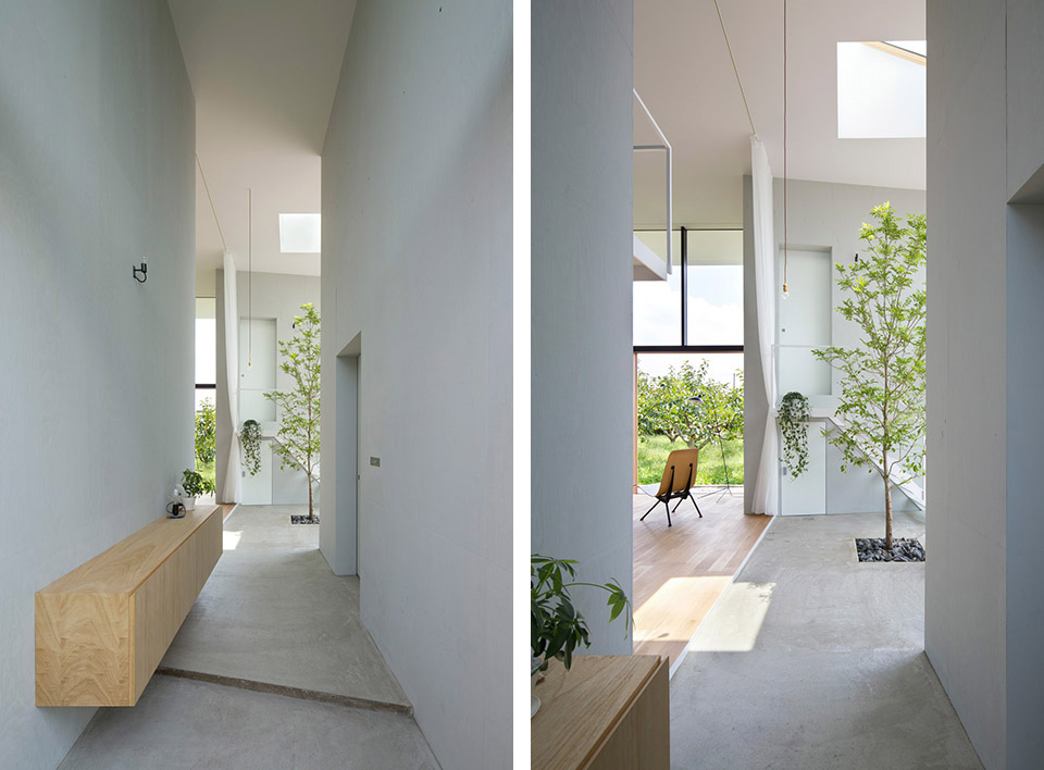 果園內(nèi)的樹木成為了住宅的天然隱私屏障與自然風(fēng)景。身處其間的住宅構(gòu)架開放,可以簡單理解為7個結(jié)構(gòu)體支撐起一個巨大的屋頂,這七個結(jié)構(gòu)體有相當(dāng)?shù)暮穸?,所有的私人空間比如衛(wèi)生間和臥室都位于其中,而7個結(jié)構(gòu)體之間,屋頂下方的自由空間,是住宅的公共空間—客廳,餐廳,廚房。