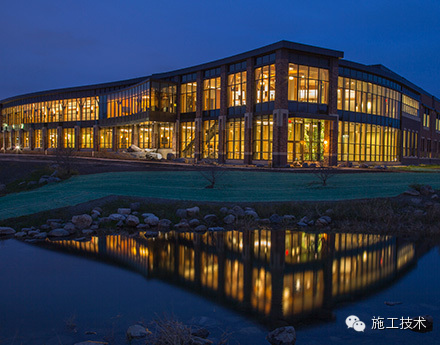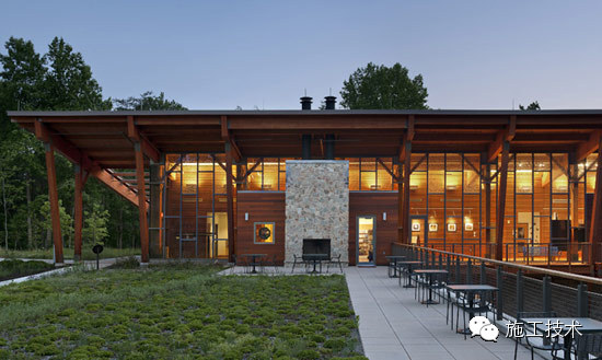 建筑物的桁架為膠合層壓板,從而優(yōu)化了這種可再生資源的結(jié)構(gòu)價(jià)值。膠合板消耗能源少于鋼筋混凝土或鋼材,可用于更長(zhǎng)的時(shí)間跨度,可承受重負(fù)荷,并且擁有復(fù)雜 的形狀。該建筑通過(guò)了LEED環(huán)境保護(hù)認(rèn)證,包括一套可再生的膠合板結(jié)構(gòu)系、節(jié)水管道夾具、利用可回收的當(dāng)?shù)夭牧?、室?nèi)擁有豐富的自然光線(xiàn)以及高效的機(jī)械 系統(tǒng)、照明和外表皮。