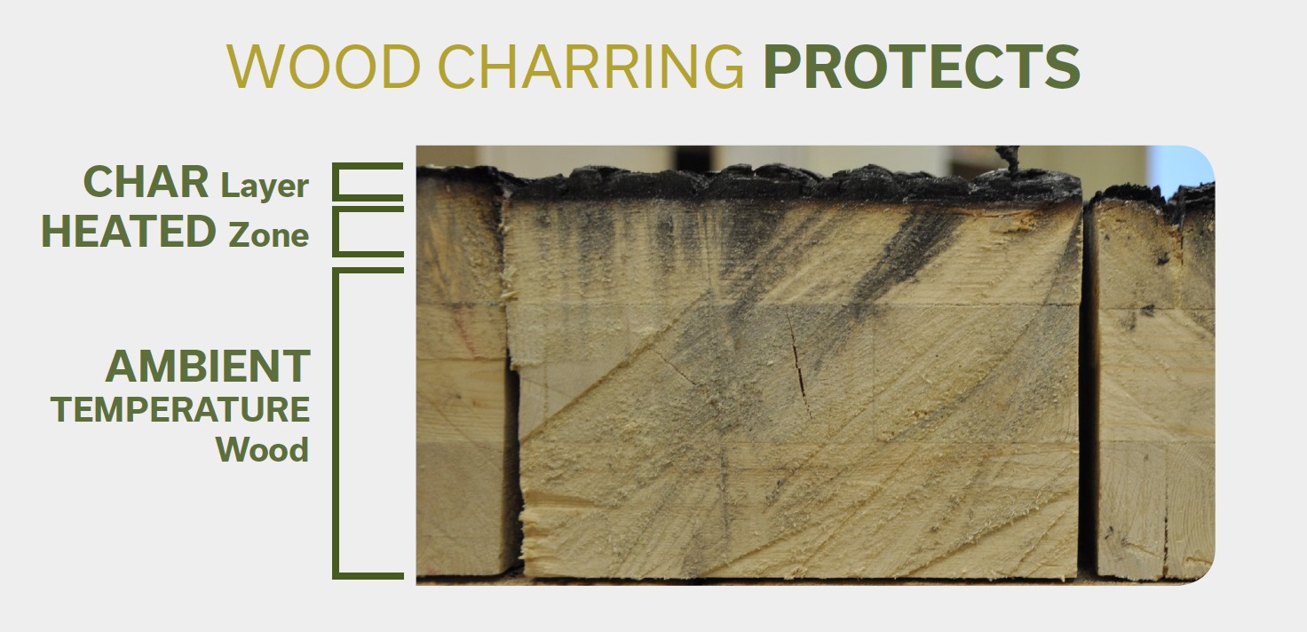 大塊木材通過(guò)內(nèi)層的隔熱層而具有耐火性。當(dāng)木材暴露于火中時(shí),暴露的表面會(huì)燃燒,從而形成自然的碳化保護(hù)層。炭化層作為隔離層,延遲了下層木芯的加熱。由于大塊木材是由實(shí)心的部件組成,空氣和火勢(shì)蔓延被抑制了。炭以可預(yù)測(cè)的速率(約3.81厘米每小時(shí))形成,以減慢燃燒和火勢(shì)蔓延。