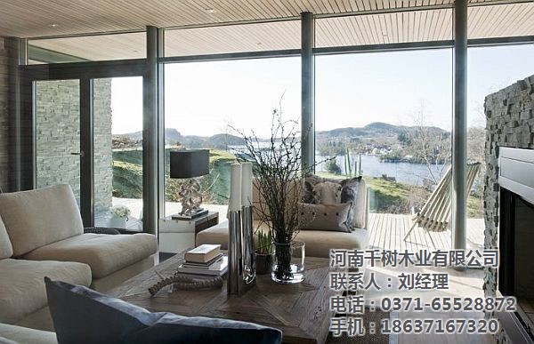 河南木別墅的尺寸和視野,是我們喜歡的一個焦點。特別對于度假木屋,在室內平靜的與戶外自然景觀對話,是大窗戶的重要意義。大窗戶在木屋中,提供最佳漂亮的風格,當然對于木屋設計也是至關重要,如何漂亮美觀還要節(jié)能。如:窗戶與墻壁空間的比例、窗戶的形狀和尺寸及屋頂?shù)呐渲枚际窃O計的考慮因素,方向葉是很重要的,可能會建議包括深檐和傾斜的窗戶方向以便在減輕陽光。