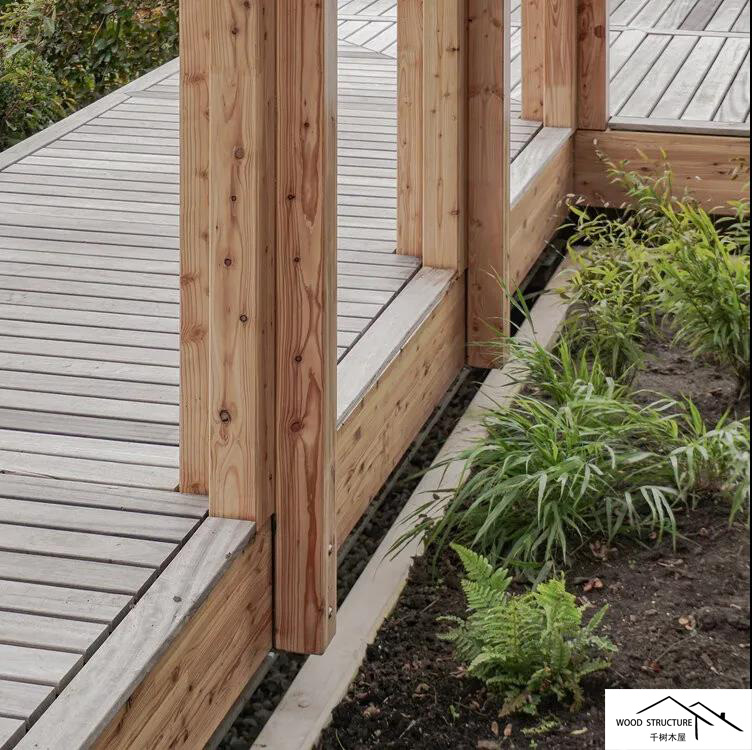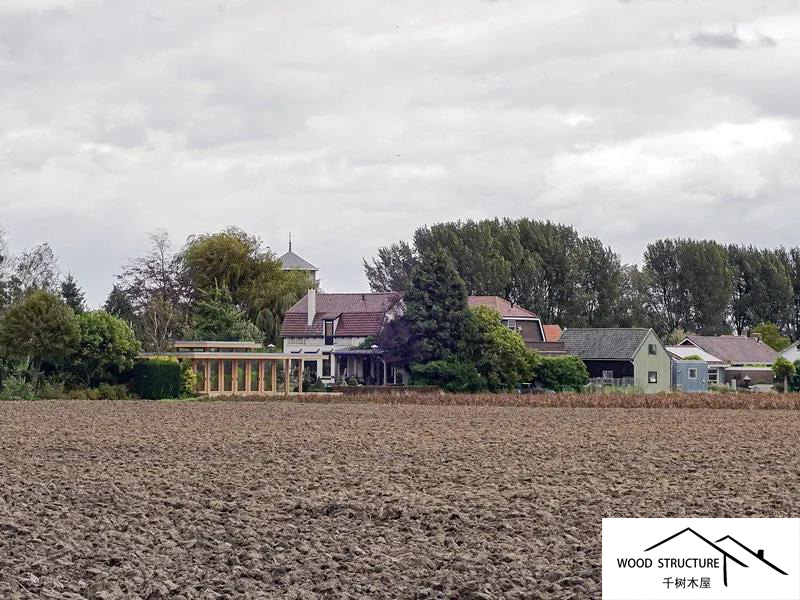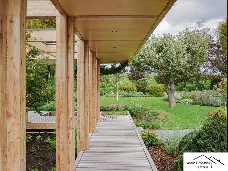 露臺(tái)甲板橋面懸挑在一條現(xiàn)有的溝渠上,這條溝渠創(chuàng)造了花園和農(nóng)田之間的邊界。從這個(gè)有利的位置可以觀察到不斷變化的農(nóng)田。涼棚與建筑結(jié)合在一起,從內(nèi)部與花園建立了非常直接的關(guān)系。大部分雨水通過(guò)屋頂引導(dǎo)到?jīng)雠?,灌溉植物和?shù)木。這個(gè)模塊化結(jié)構(gòu)采用落葉松層壓膠合板與CLT組合而成。
