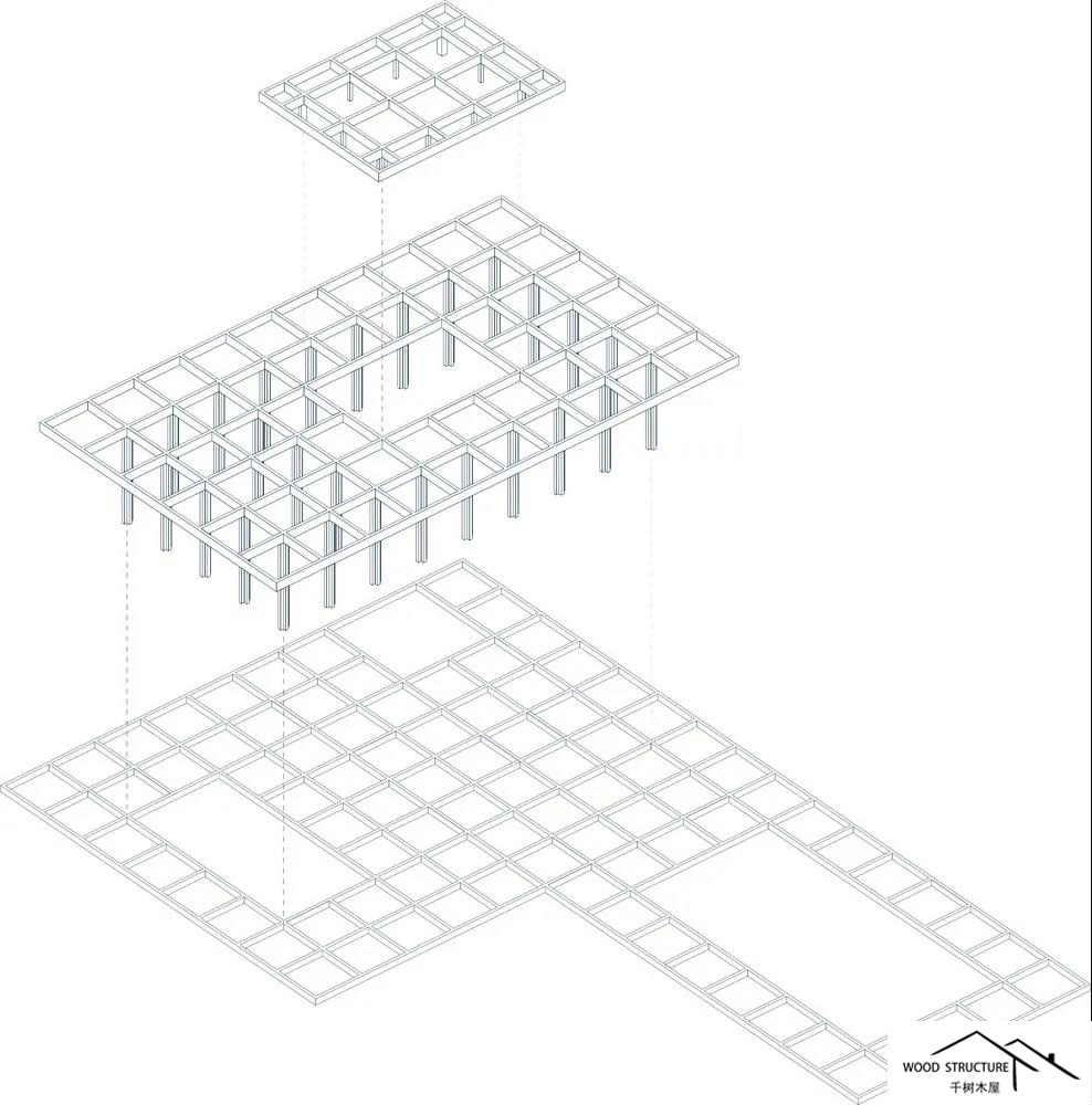 三個(gè)CLT墻體組成的結(jié)構(gòu)增加了柱和梁結(jié)構(gòu)的穩(wěn)定性。它是一個(gè)1.5米模數(shù)網(wǎng)格上的模塊化結(jié)構(gòu)設(shè)計(jì)。十字形的柱子放在網(wǎng)格上,支撐著屋頂。模塊化結(jié)構(gòu)由六個(gè)預(yù)制構(gòu)件填充。內(nèi)部樓層地板、外部樓層地板、開(kāi)放式立面、封閉式立面、內(nèi)部屋頂板和外部屋頂板。在某些地方,建筑被故意留下未填充的空間,為植物和樹(shù)木創(chuàng)造空間。木材,木材,木材,這個(gè)建筑是用木材做的,以盡可能降低“碳排放”。