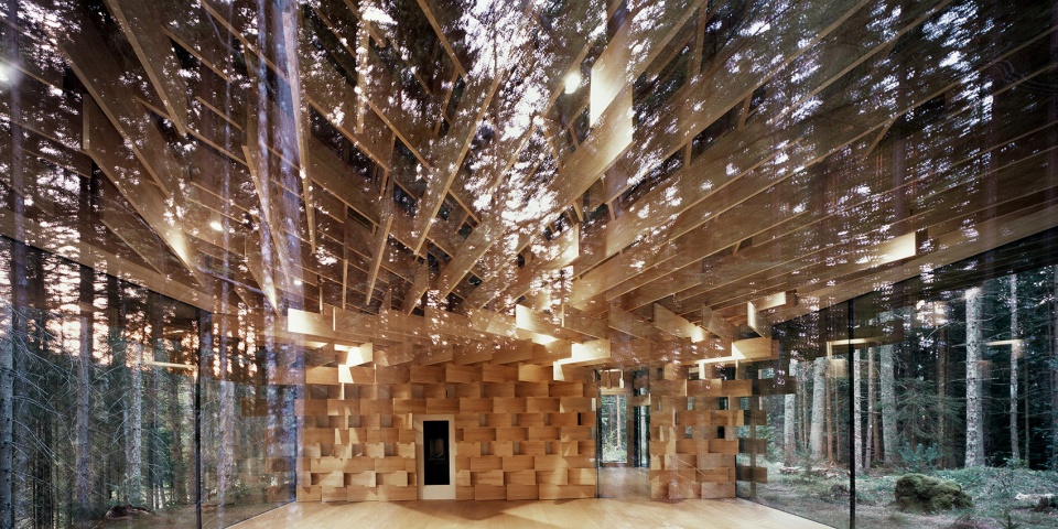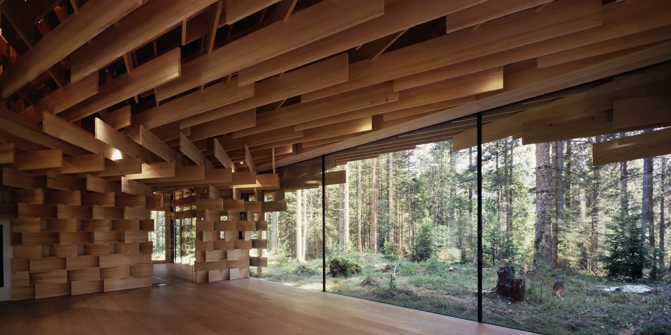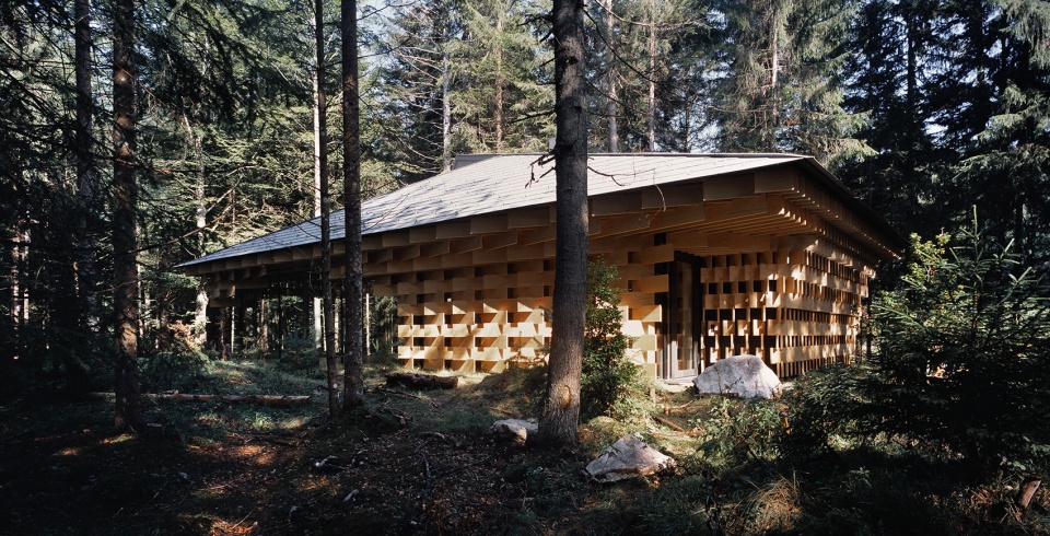 該建筑以生長在場(chǎng)地附近的冷杉樹為主要材料,3厘米寬的木板像樹枝一樣堆疊起來,在廣闊的森林和精致的建筑間形成一種柔和的過渡。小屋同樣也充當(dāng)了使人融入森林的媒介。陽光透過枝葉間的縫隙從天窗透進(jìn)室內(nèi),帶來森林中常??梢泽w驗(yàn)到的“komorebi”(木漏れ日)般的效果。