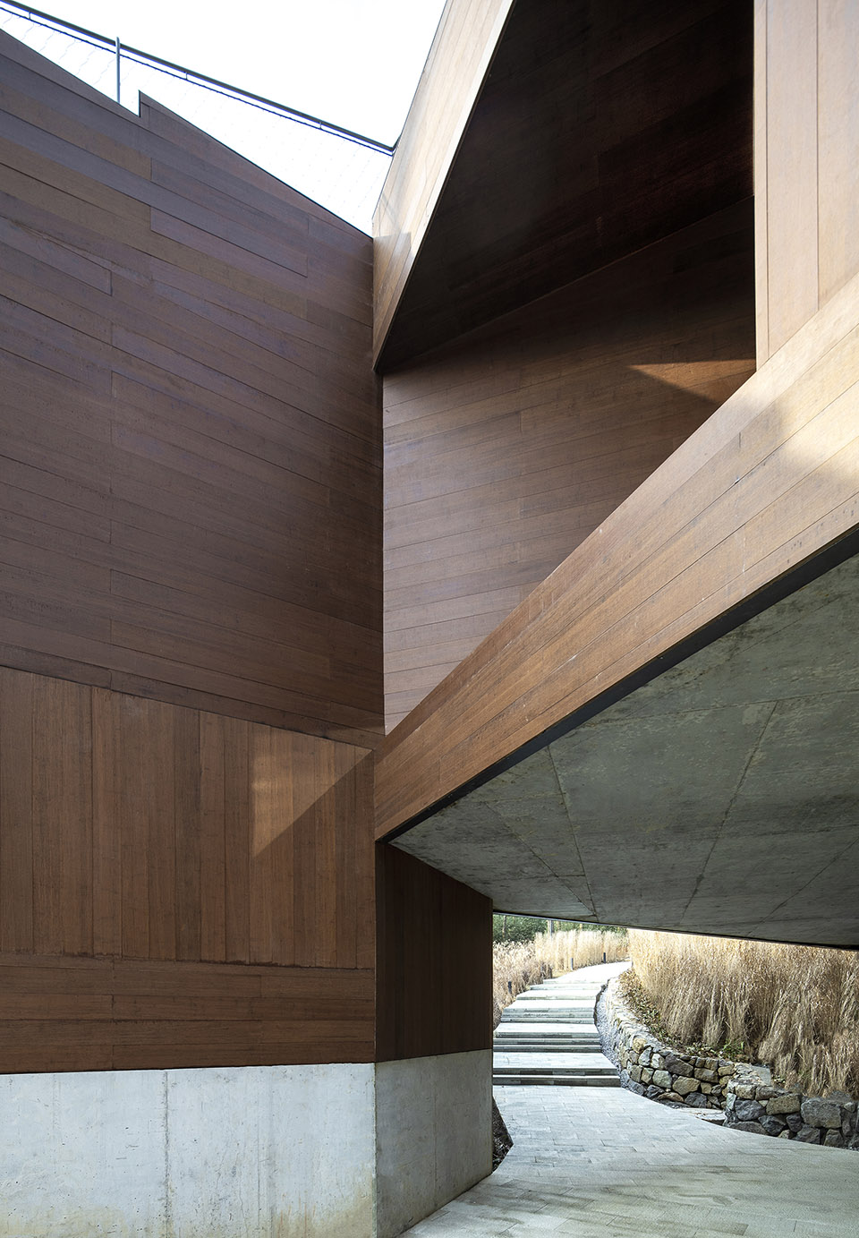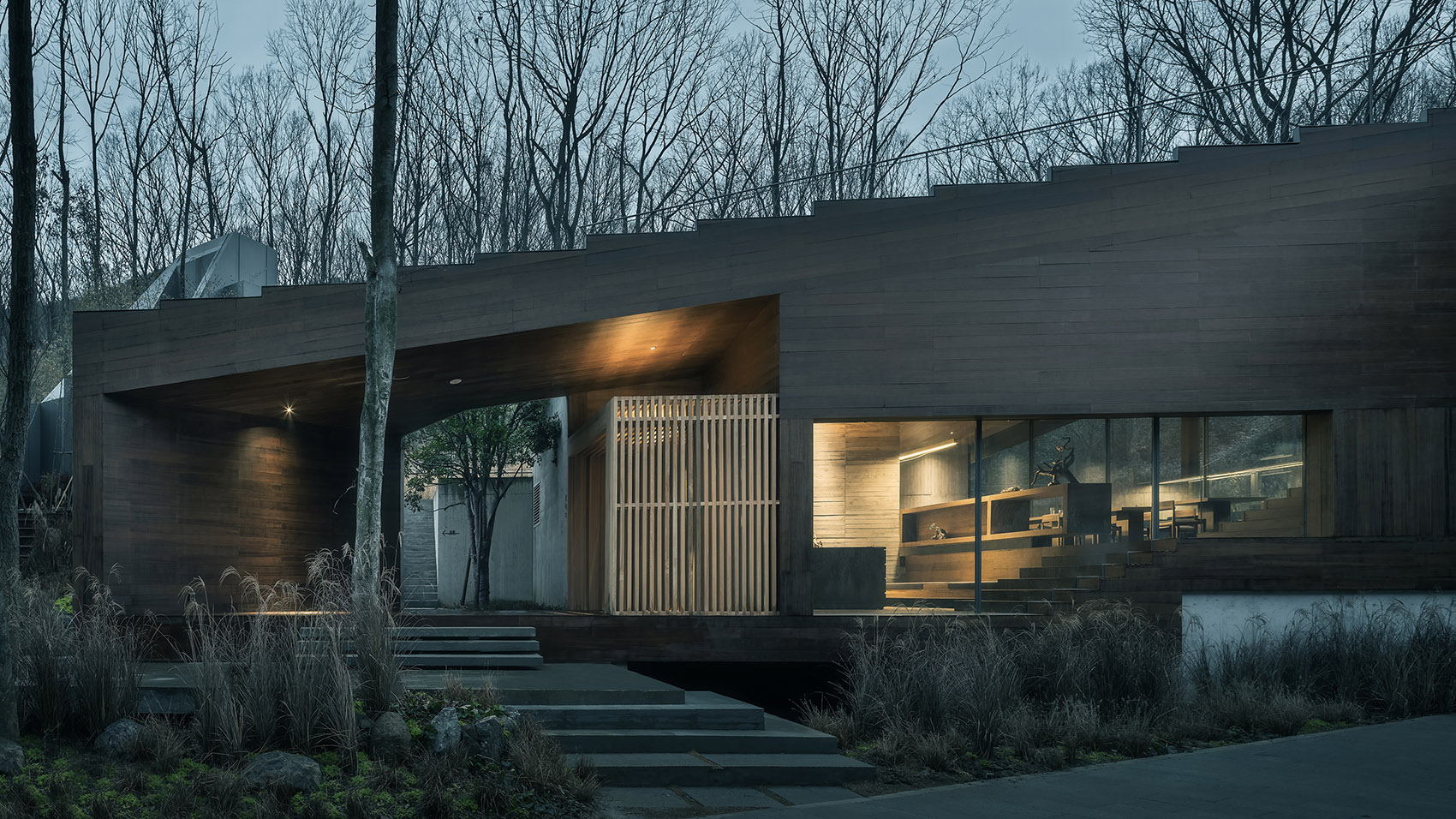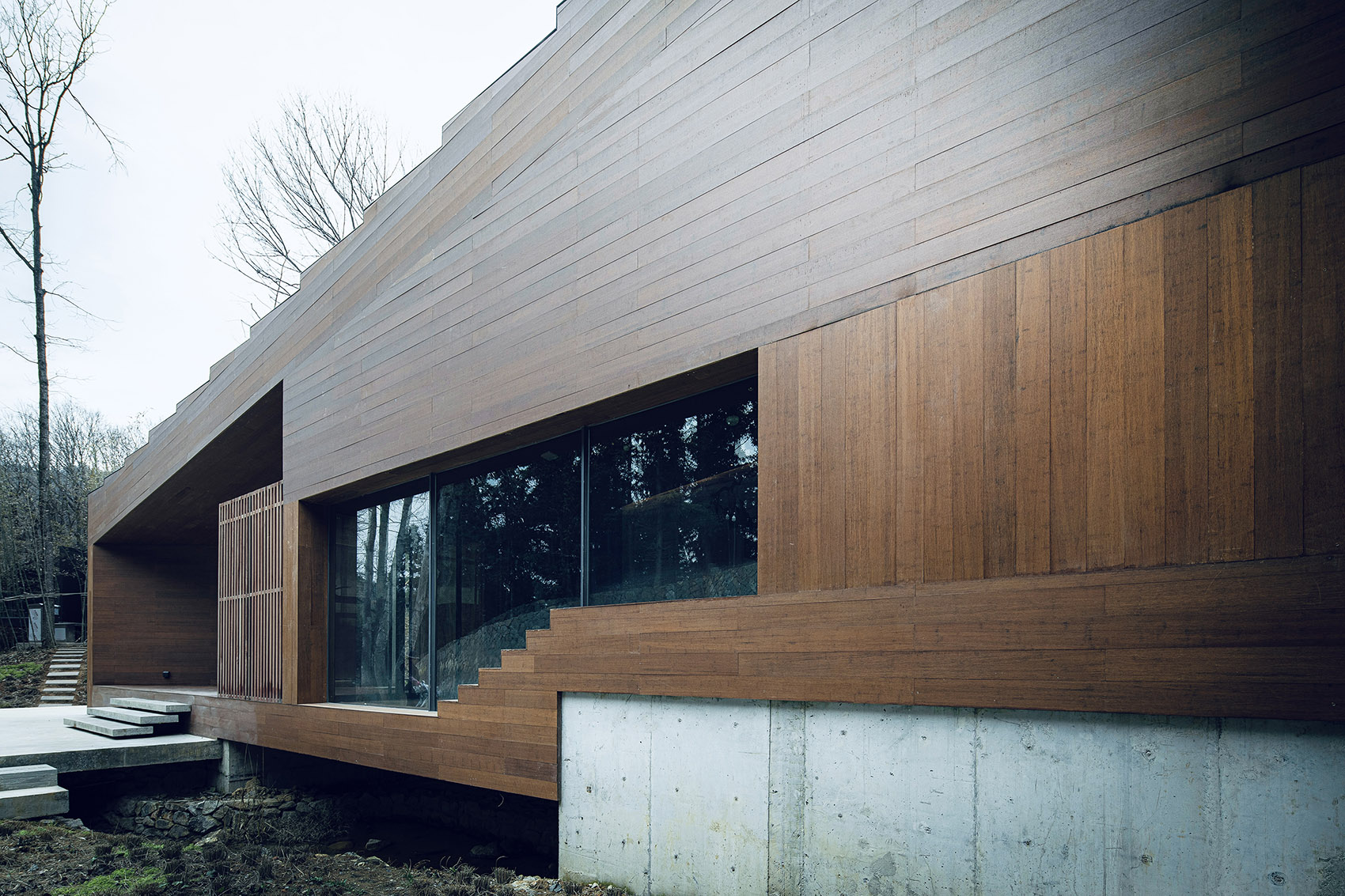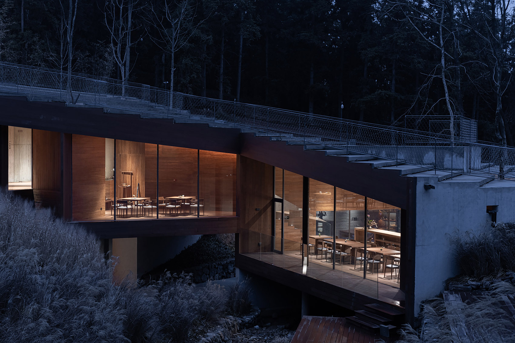 建筑的另外兩側(cè)分別嵌入山體之中,架空的蝶狀建筑的下方仍然保留了溪水和山路的通道。為了將部分樹木保留在室內(nèi),豎向結(jié)構(gòu)被設(shè)計成“柱院”,結(jié)構(gòu)意義上是柱子,空間意義上,是保留了一棵樹的“微院”。屋面是一個臺階狀的坡屋頂,可作為小型演出的森林劇場,室內(nèi)空間被這個大坡屋頂統(tǒng)一起來,并因為不同地面標(biāo)高的變化而富有節(jié)奏。