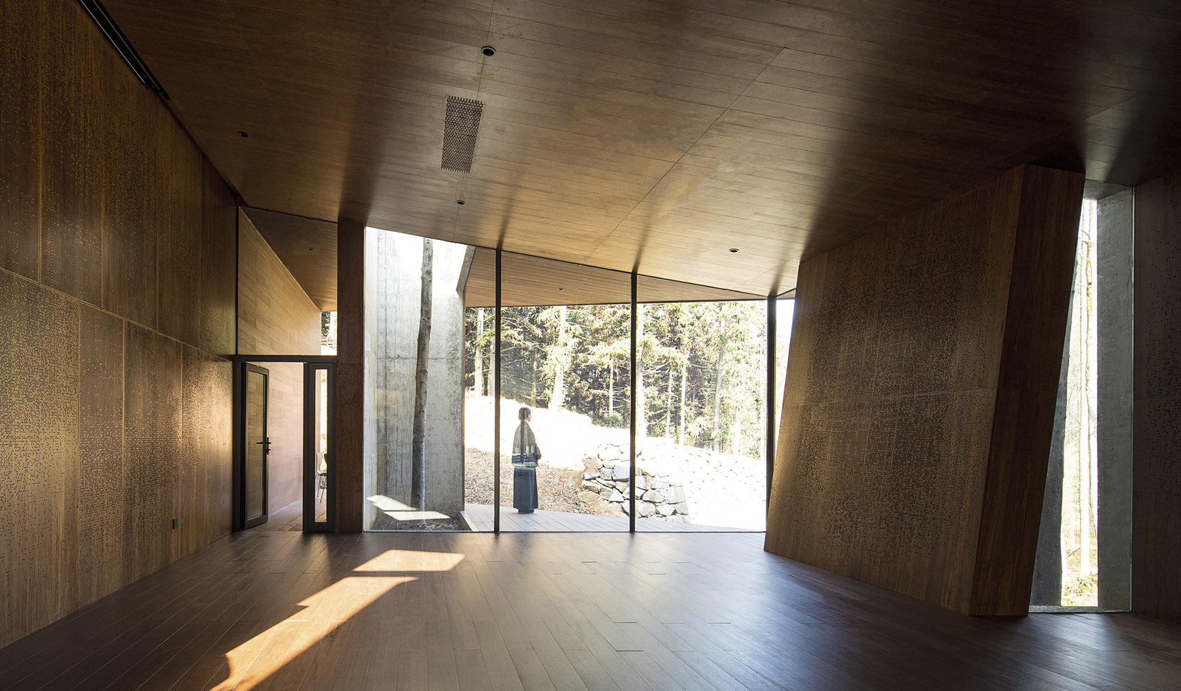 內(nèi)部每個標(biāo)高的空間,都有相應(yīng)的落地玻璃立面,錐形的頂部設(shè)置了可以看向天空和樹冠的天窗,形成了分別朝向不同的方向看風(fēng)景的組合,將外部的景觀投射到整個空間內(nèi)部,外部的風(fēng)景成了建筑的主要元素,形成空間特有的張力,這一切都是為了居于室內(nèi)可以獲得對自然更多的感知。