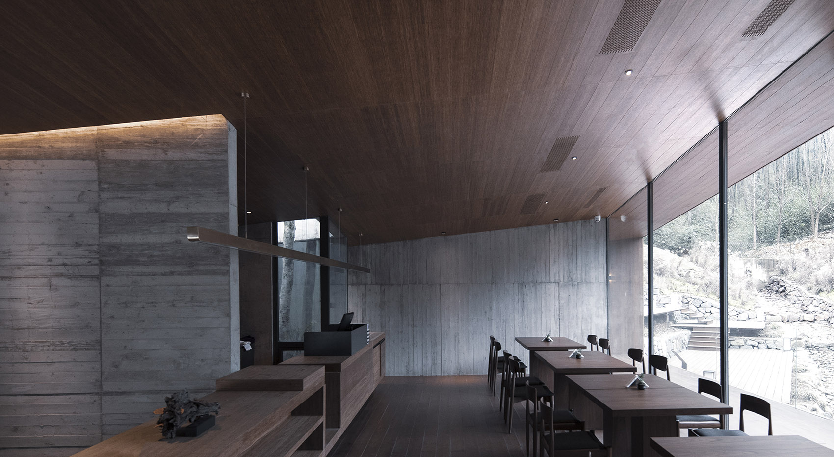 這是在杭州郊區(qū)山林里的一個休閑度假服務(wù)空間,設(shè)計是從具體的環(huán)境開始的,我們首先要思考的是做一個什么樣的空間裝置可以和這片山林對話,可以更好的順應(yīng)地形并融入這片自然,場地的特殊條件決定了建筑的特殊性。