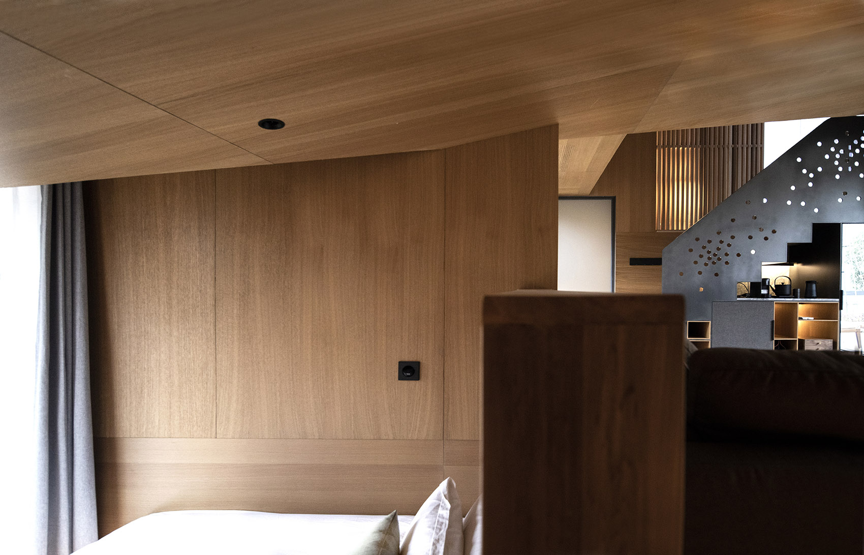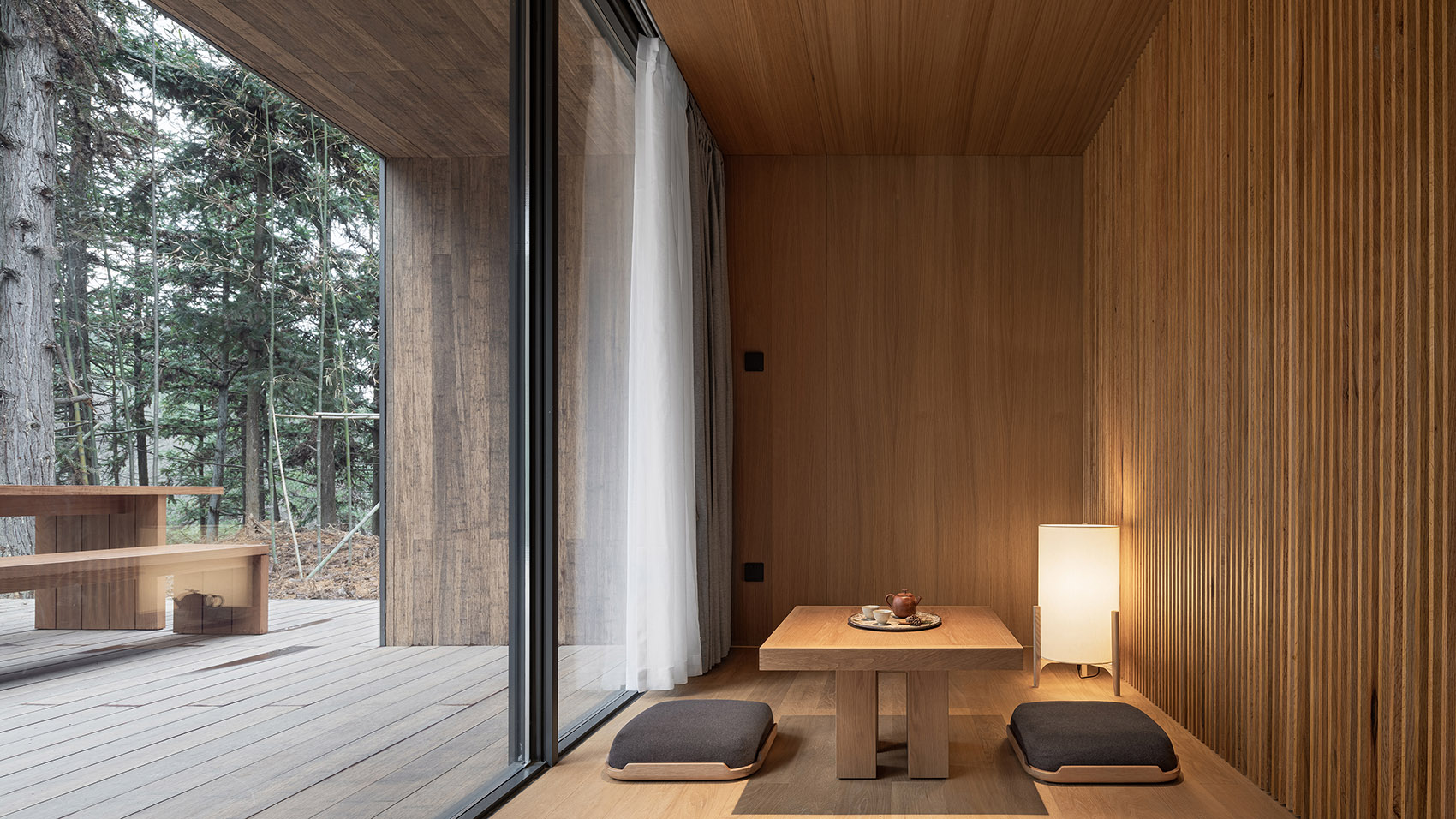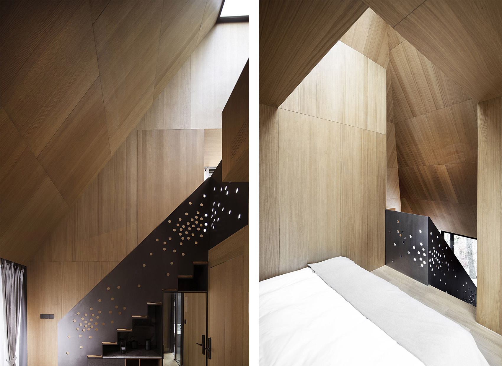 空間的大小是以人的基本尺度來定義的,建筑的墻面和屋頂都觸手可及,這種微小的尺度讓人時刻感受到建筑處于自然之中。這種接近于野營帳篷的空間體驗,希望讓人時刻感受到自然就近在咫尺,只是隔了一層外墻的厚度。通體的木質(zhì)材料提供了溫暖而舒適的建筑內(nèi)襯,給人提供了舒適而愜意的生活氛圍,這和外部自然的野趣形成的強烈的反差,這種反差讓人對自然保持敏感,更能感受到自然之美,或溫柔細(xì)膩,或爆裂冷峻。